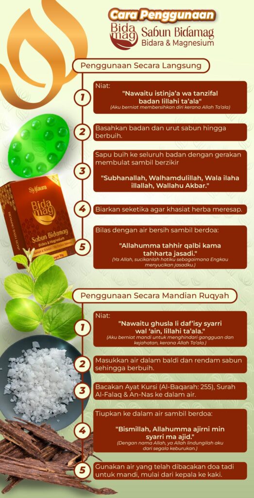 Mulakan dengan niat, basahkan sabun hingga berbuih, sapukan ke seluruh tubuh dengan urutan lembut, dan bilas dengan air suci sambil merasakan ketenangan dan aura positif.